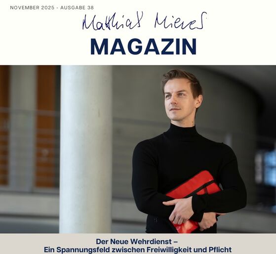 der Herbst ist da - und mit ihm die neue Ausgabe des MM-Magazins. In der aktuellen Ausgabe erfahrt ihr, welche Meinung ich zur neuen Wehrpflicht habe. Außerdem gibt es Infos zu den Beschlüssen der Regierungskoalition zu den Themen Grundsicherung, Rente und Infrastruktur. Und natürlich gibt es auch einen Essenstipp von mir.